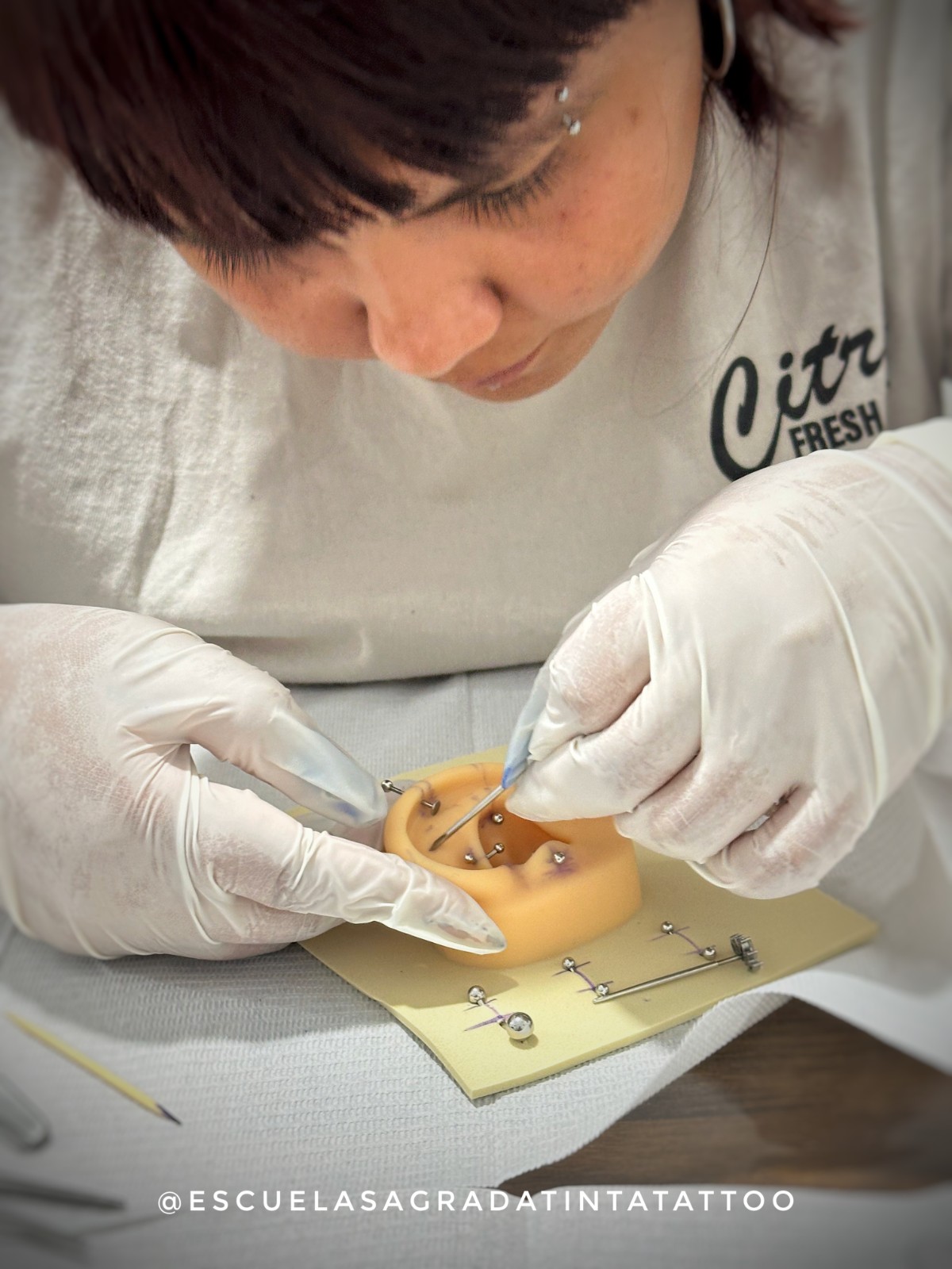 Formación en body piercing, joyería dental (tooth gems), micropigmentación y estilos como dotwork, handpoked y patchwork.